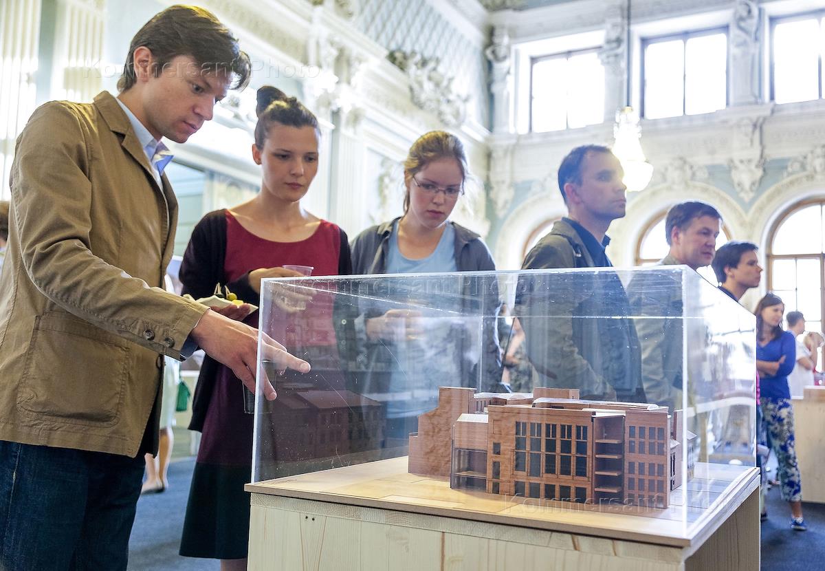 Visitors to the exhibition of architectural finalists for the reconstruction of the Small Marble Palace (Gagarin Str. 3, the building of the European University).