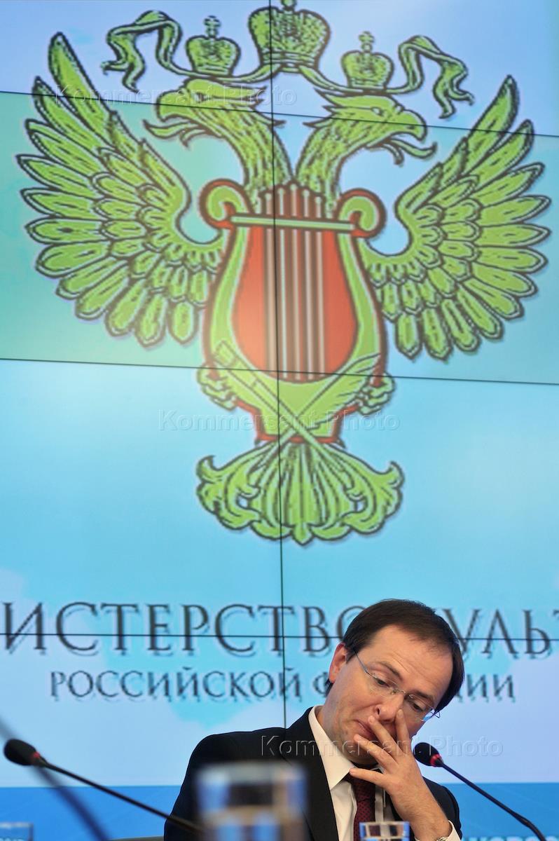 Министр культуры России Владимир Мединский во время пресс-конференции на тему "День российского кино: господдержка, обновление, развитие". Пресс-конференция прошла в РИА "Новости".