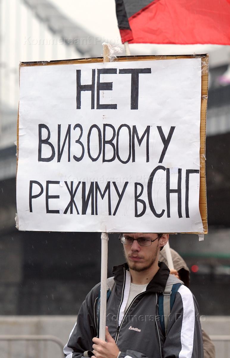 Митинг против ксенофобной политики властей, антимигрантской истерии, этнических чисток и строительства концлагерей прошел в Гайд-парке в Центральном парке культуры и отдыха им. Горького. Плакат "Нет визовому режиму в СНГ!".
