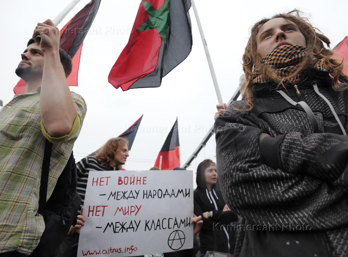 Митинг против ксенофобной политики властей, антимигрантской истерии, этнических чисток и строительства концлагерей прошел в Гайд-парке в Центральном парке культуры и отдыха им. Горького. Плакат "Нет войне - между народами! Нет мира - между классами!".