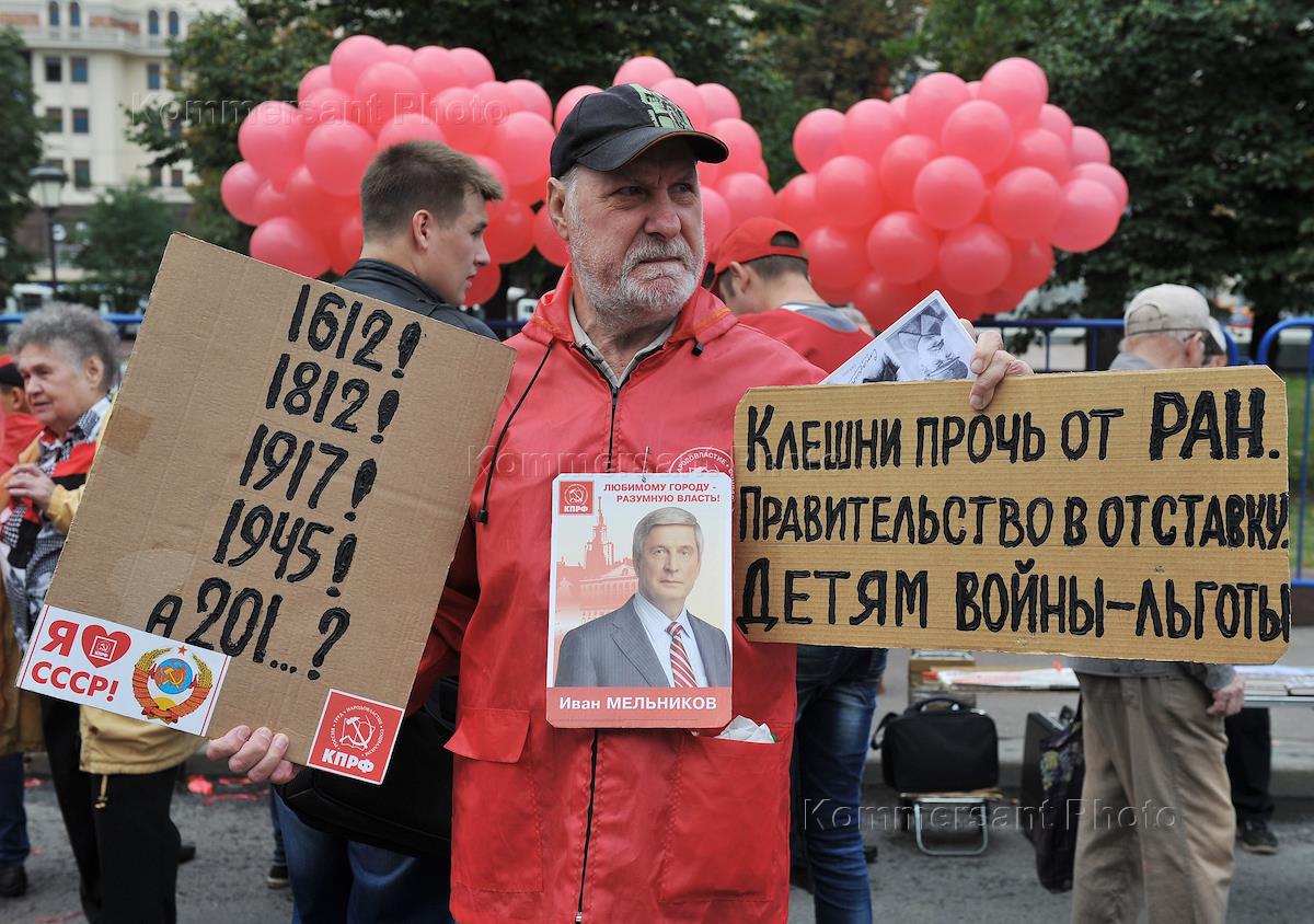 Nationwide rally in support of the initiative of Communist Party on the resignation of the Russian Federation government, abolition of the RAS reform, in support of the bill of the Communist Party "Children of War" took place in Revolution Square. Participants in the flag with the inscription "Moscow for Melnikov" and the inscription on the back of his jacket "Chernobyl veterans against Mayor Sobyanin".