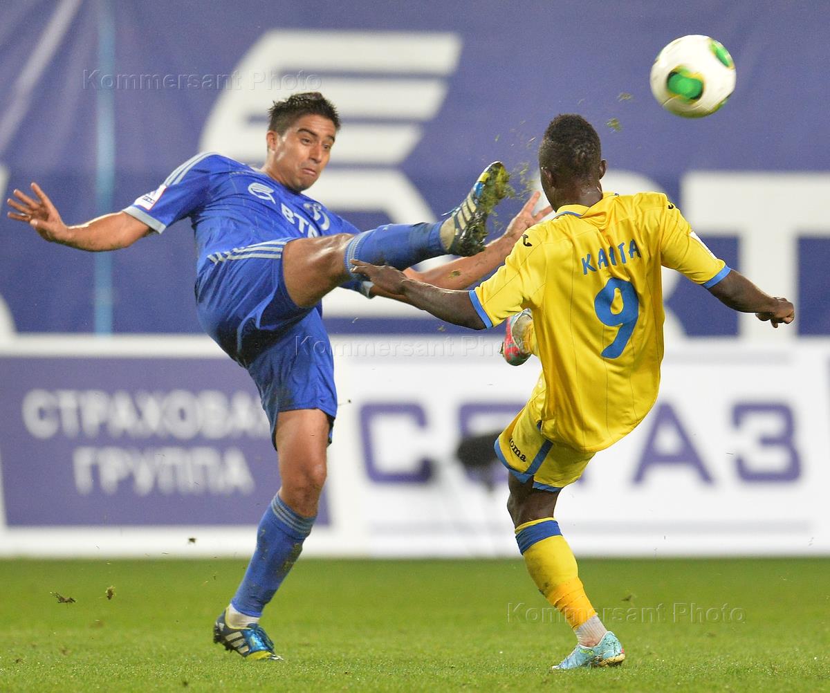 SOGAZ - Russian Football Championships. Season 2013/2014. Defender of FC "Dynamo" Marco Lomich (left) and midfielder of FC "Rostov" Timofey Kalachev (right) during a match between "Dynamo" (Moscow) and "Rostov" (Rostov-on-Don). The match took place at the stadium "Arena Khimki".