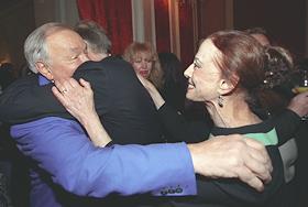 Поэт Андрей Вознесенский (слева) и балерина Майя Плисецкая (справа) поздравляют композитора Родиона Щедрина (в центре) на его юбилейном творческом вечере. Вечер состоялся на сцене Государственного академического Большого театра (ГАБТ).