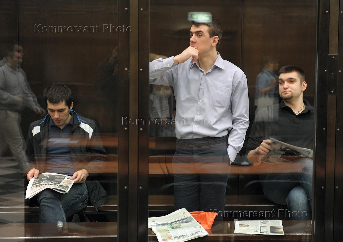 Справа налево: обвиняемые по делу о массовых беспорядках на Болотной площади 6 мая 2012 года Денис Луцкевич, Андрей Барабанов и Ярослав Белоусов во время судебного заседания в Московском городском суде.