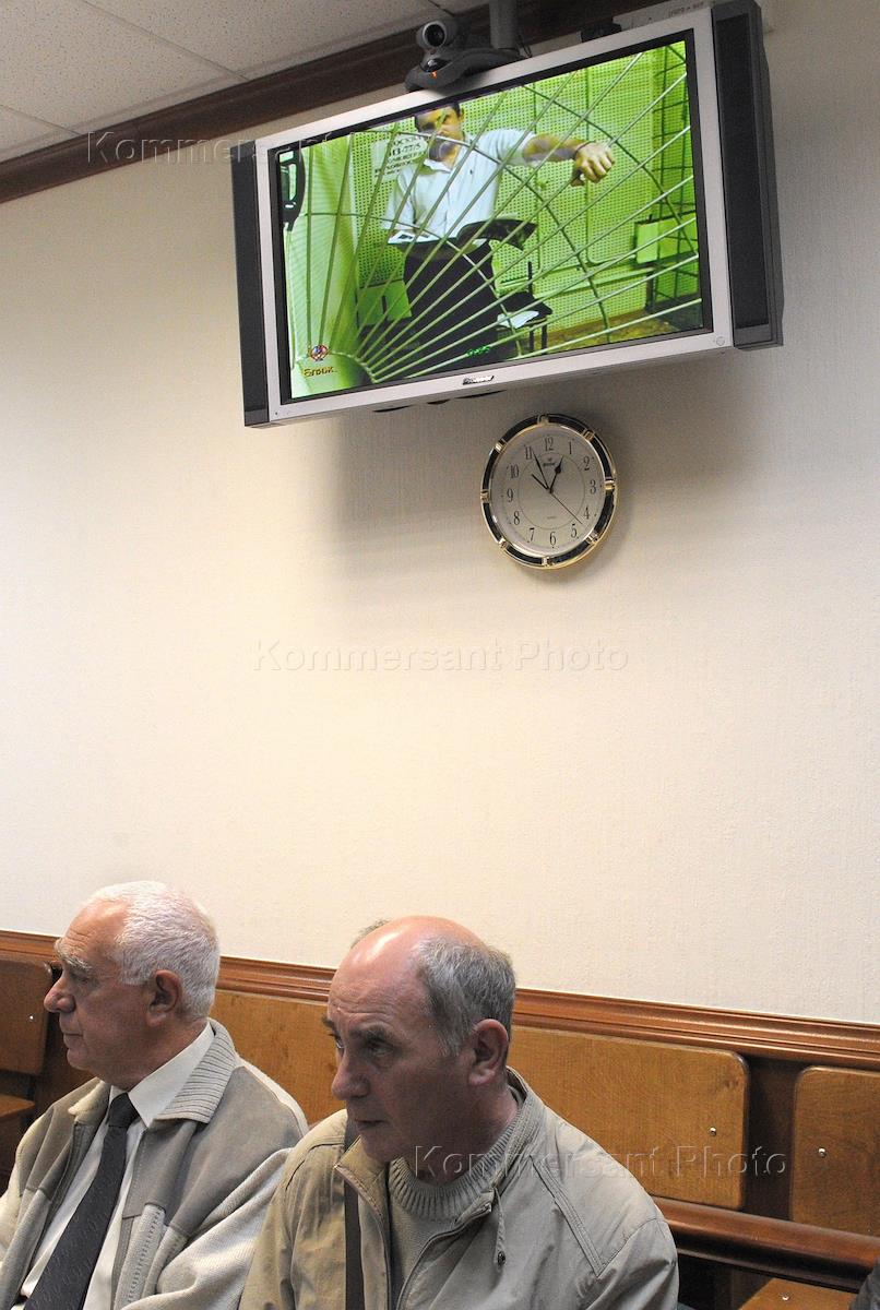 The accused on charges of rioting in Bolotnaya Square May 6, 2012 Alexander Margolin (on screen) during an appeal to extend his arrest at a meeting of the Moscow City Court.