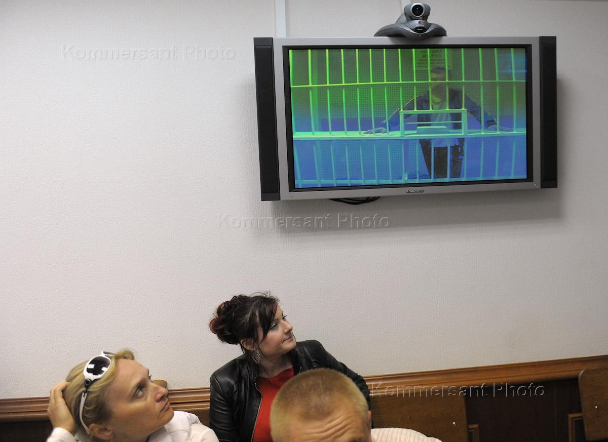 The accused on charges of rioting in Bolotnaya Square May 6, 2012 Mikhail Kosenko (on screen) during an appeal to extend his arrest at a meeting of the Moscow City Court.
