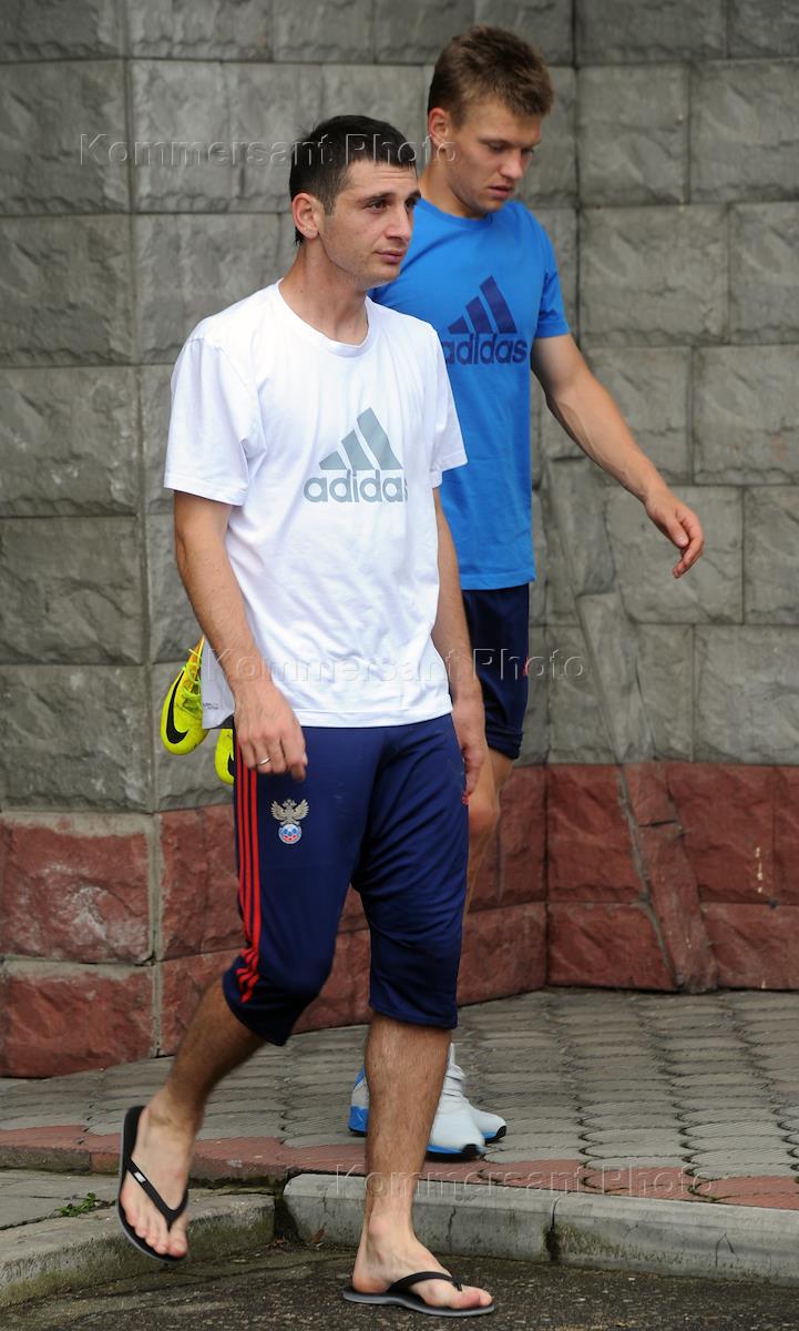 Russian National team player Alan Dzagoev (left) after a training session of the Russian national football team at the stadium named Streltsov.