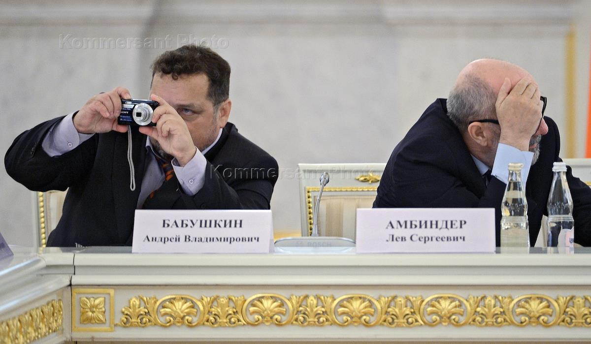 Chairman of the inter-regional public charitable human rights organization "Committee for Civil Rights" Andrey Babushkin (left) and president of the nonprofit charity organization "Help" Lev Ambinder (right) during a meeting of the Council for Civil Society Institutions and Human Rights. The meeting was held in the Alexander Hall of the Grand Kremlin Palace.