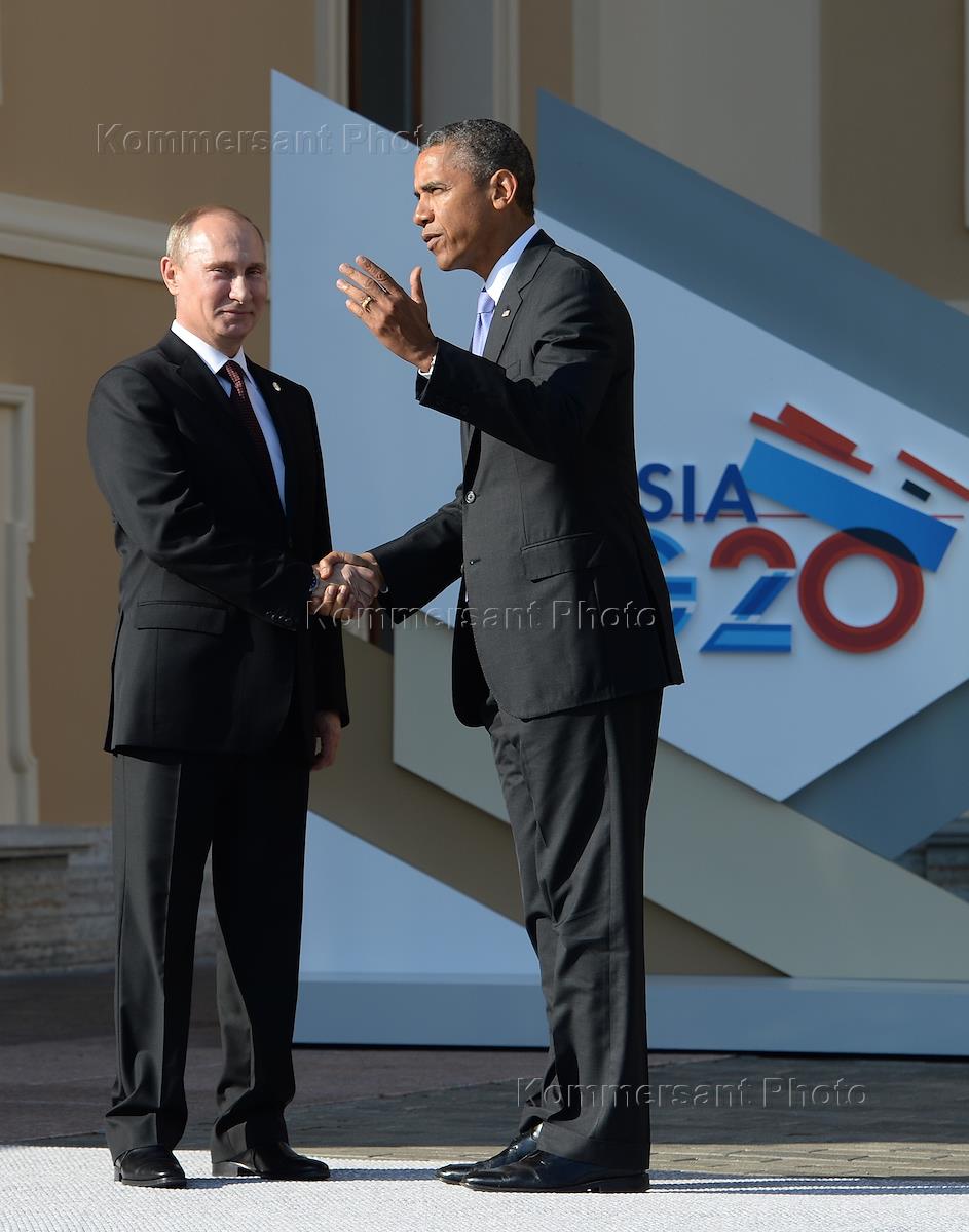 Summit of leaders of the member states "Group of Twenty" G20. U.S. President Barack Obama (left) and Russian President Vladimir Putin (right) during a meeting at the Constantine Palace in Strelna.