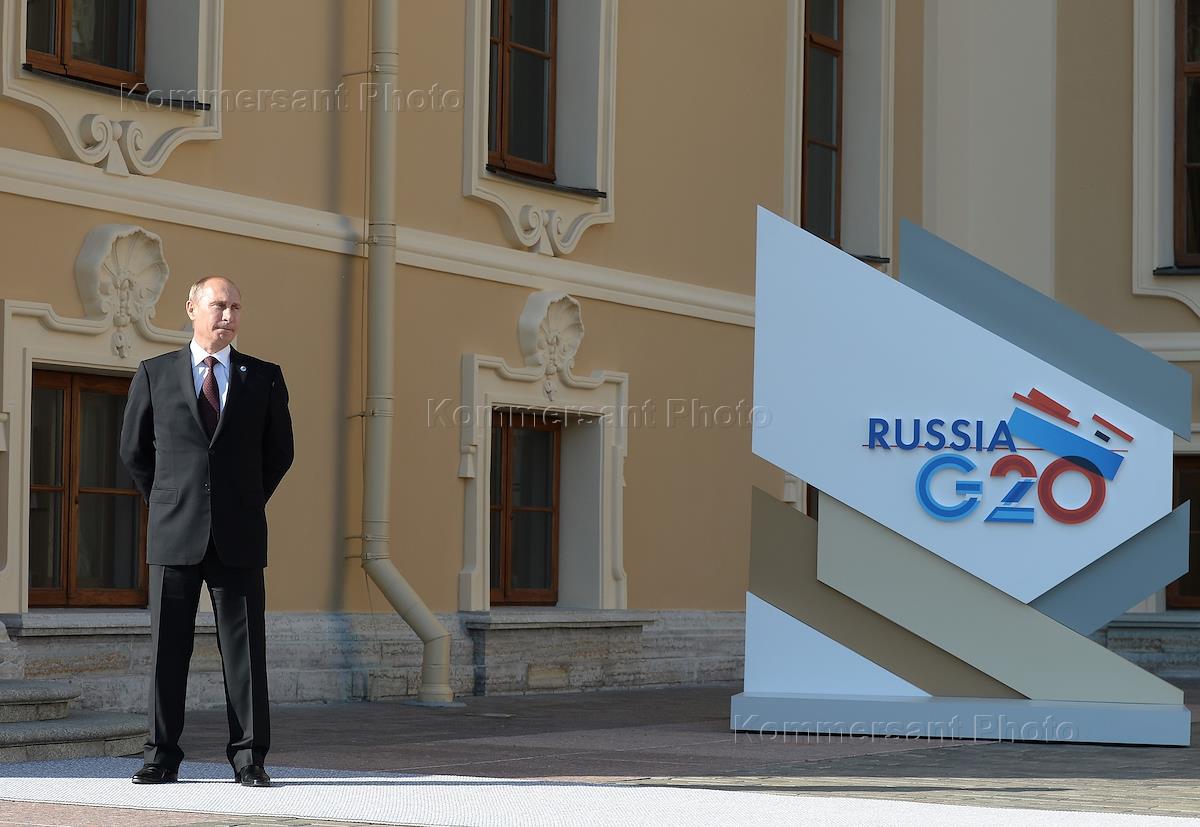 Summit of leaders of the member states "Group of Twenty" G20. Russian President Vladimir Putin (left) during a meeting at the Constantine Palace in Strelna.