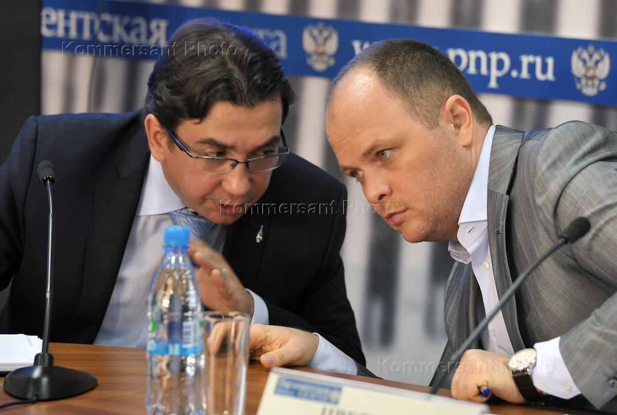 Chairman of the Presidium of the All-Russian public organization "Russian Officers" Anton Tsvetkov (left) and Head of the Centre illegal migration Pavel Pyatnitskii (right) at a meeting of the "Round Table". A "Round table" on "Ways of combating illegal immigration" was held at the press center "Parlamentskaya newspaper".