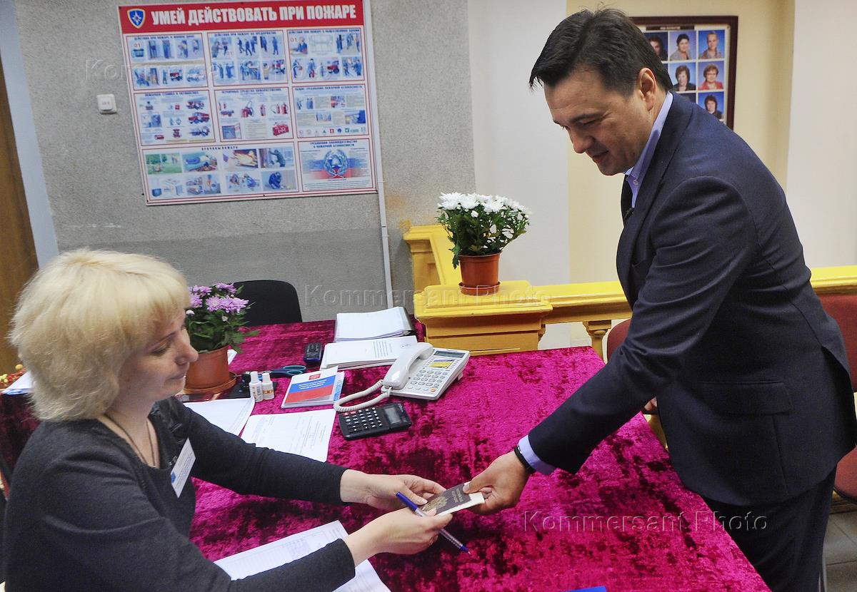 Единый день голосования. Выборы губернатора Московской области. Временно исполняющий обязанности губернатора Московской области Андрей Воробьев во время голосования на избирательном участке в селе Знаменское Одинцовского района.