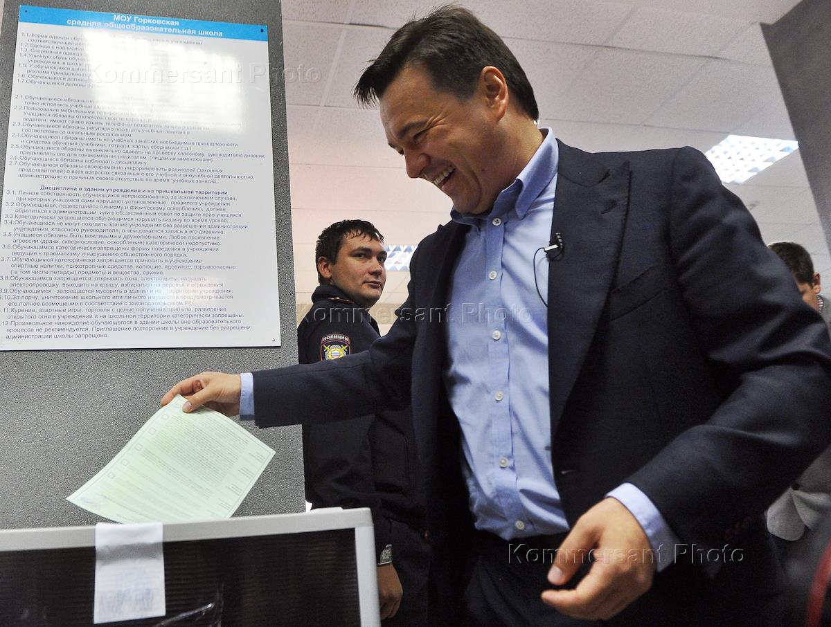Единый день голосования. Выборы губернатора Московской области. Временно исполняющий обязанности губернатора Московской области Андрей Воробьев после голосования на избирательном участке в селе Знаменское Одинцовского района.