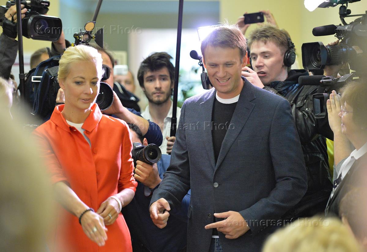Election of the Moscow Mayor. Candidate for mayor of Moscow, the chairman of the Coordinating Council of opposition (CSR) Alexei Navalny with his wife Yulia during voting at the polling station and the school №1043.