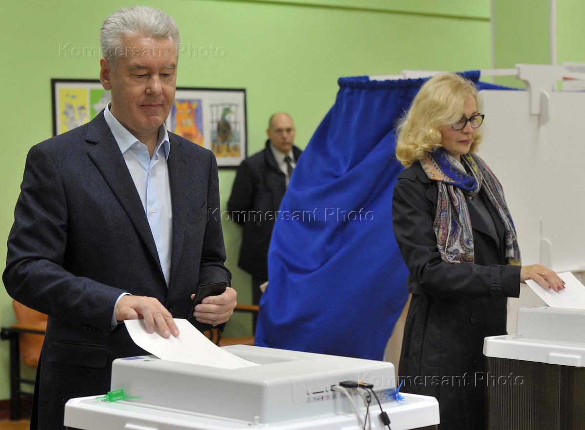 Unified day of voting. Election of the Mayor of Moscow. Acting Mayor of Moscow Sergei Sobyanin with his wife Irina during voting at polling station №98 in school 87.