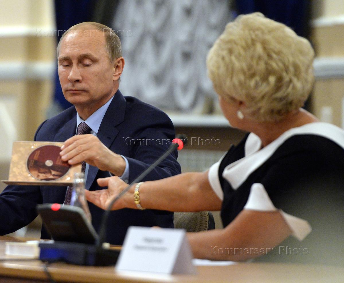 Russian President Vladimir Putin (left) and President of St. Petersburg public fund of Anatoly Sobchak, Lyudmila Narusova (right) during the presentation of the collected works of the former St. Petersburg Mayor Anatoly Sobchak. Presentation took place at the Faculty of St. Petersburg State University.