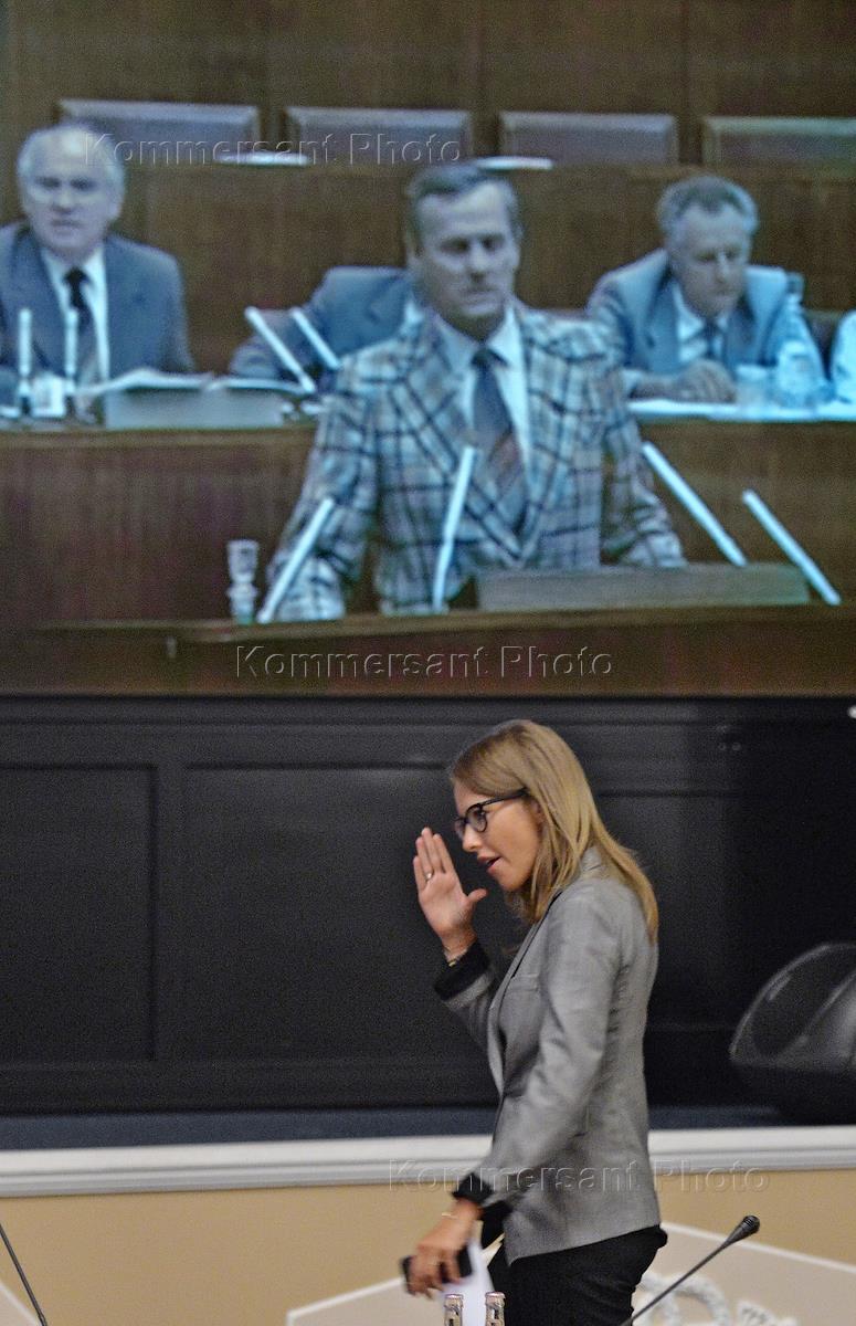 TV presenter, chief editor of SNC Ksenia Sobchak during the presentation of the collected works of the former St. Petersburg Mayor Anatoly Sobchak. Presentation took place at the Faculty of St. Petersburg State University.