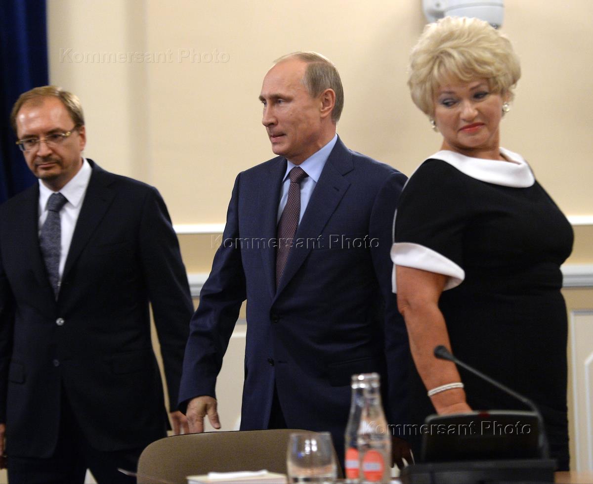 From left to right: Rector of St. Petersburg State University, Nikolai Kropachev, Russian President Vladimir Putin and President of St. Petersburg public fund of Anatoly Sobchak, Lyudmila Narusova during the presentation of the collected works of the former St. Petersburg Mayor Anatoly Sobchak. Presentation took place at the Faculty of St. Petersburg State University.
