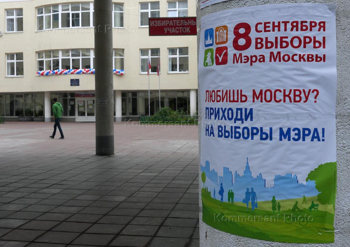 Unified day of voting. Election of the Moscow Mayor. Campaign poster outside a polling station.
