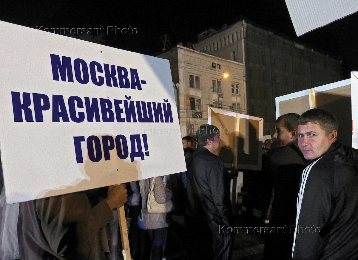 Участники митинга в поддержку кандидата на выборах мэра Москвы Сергея Собянинина на Болотной площади. Плакат с надписью "Москва - красивейший город!".