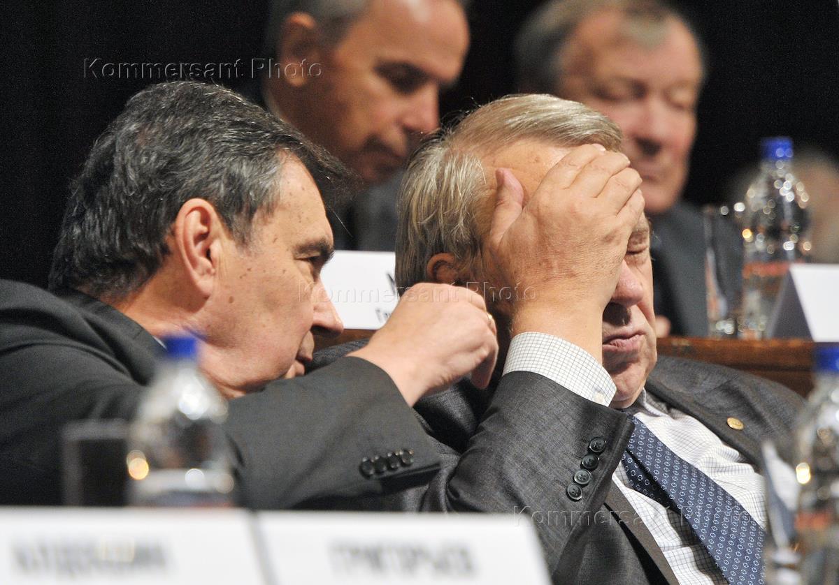 Главный ученый секретарь Президиума РАН Валерий Костюк (слева) и президент РАН Владимир Фортов (справа) на Общем собрании Российской академии наук в Большом зале Российской академии наук.