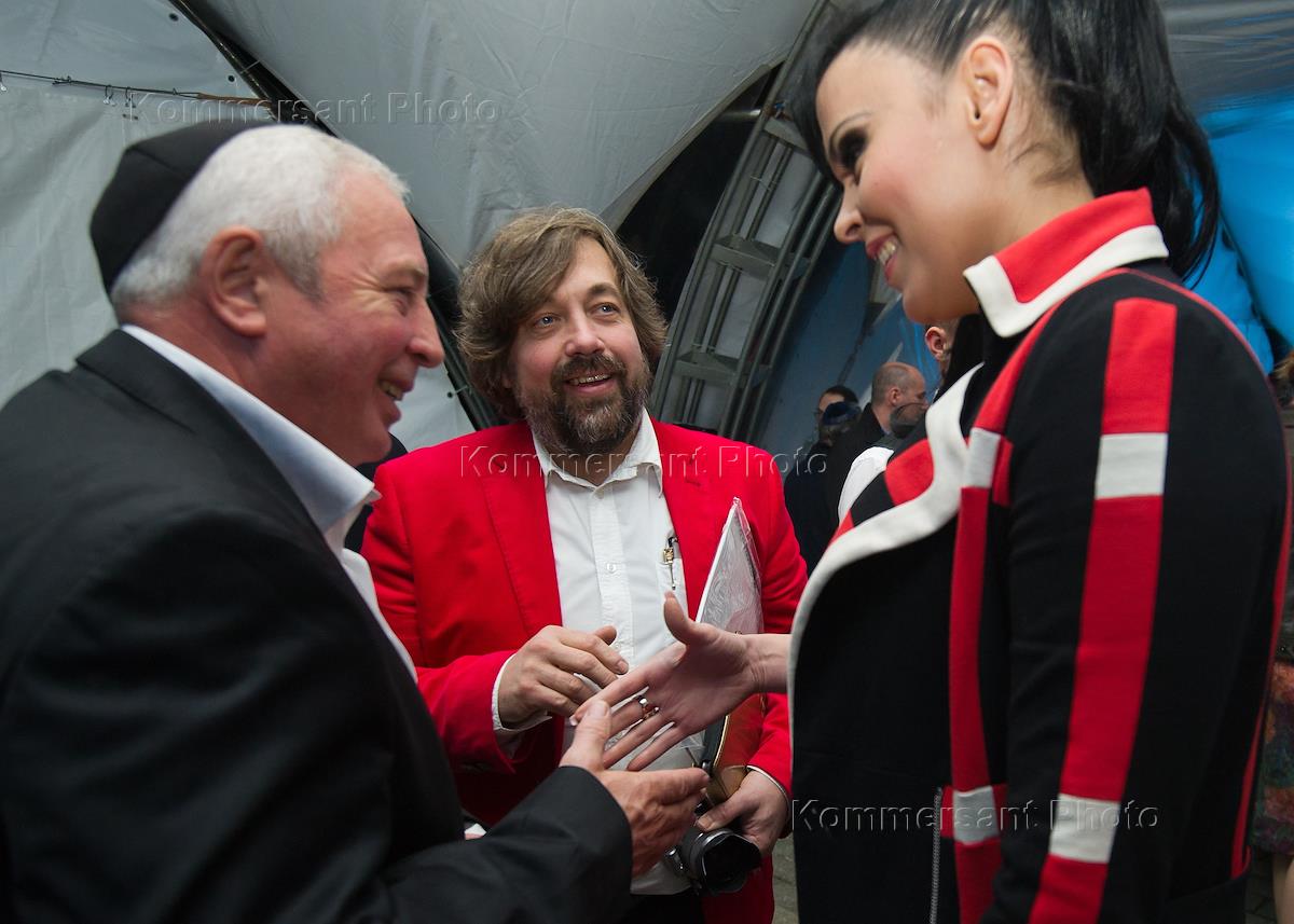 Leader of the "Time Machine" Andrei Makarevich (left) and TV hostess Tatyana Lazareva (center) during the celebration of Rosh Hashanah (New Year according to the Jewish calendar) in the synagogue memorial on Poklonnaya Hill.