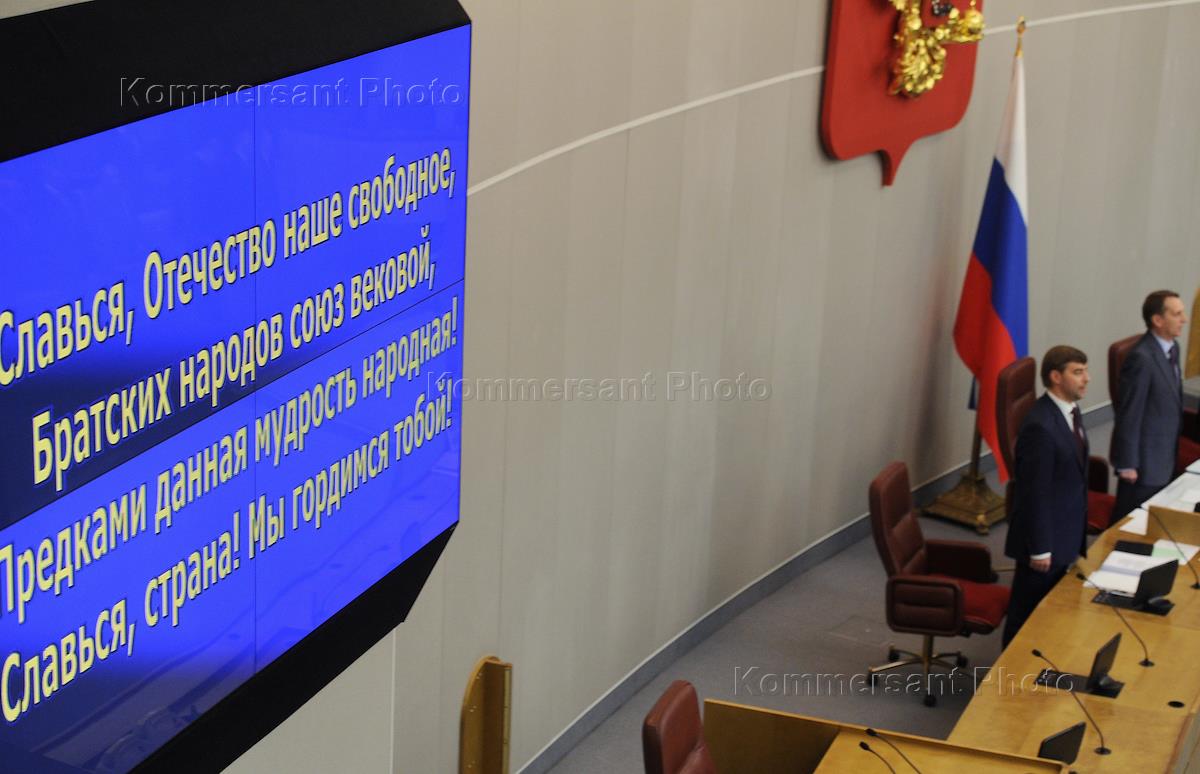 Пленарное заседание Государственной думы России. Исполнение Государственнного Гимна России во время заседания.