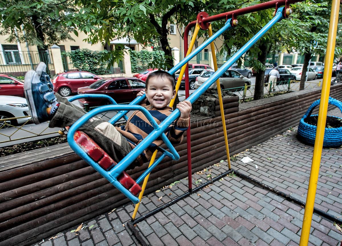 Genre photo. A child under an umbrella in the rain walking in the playground.