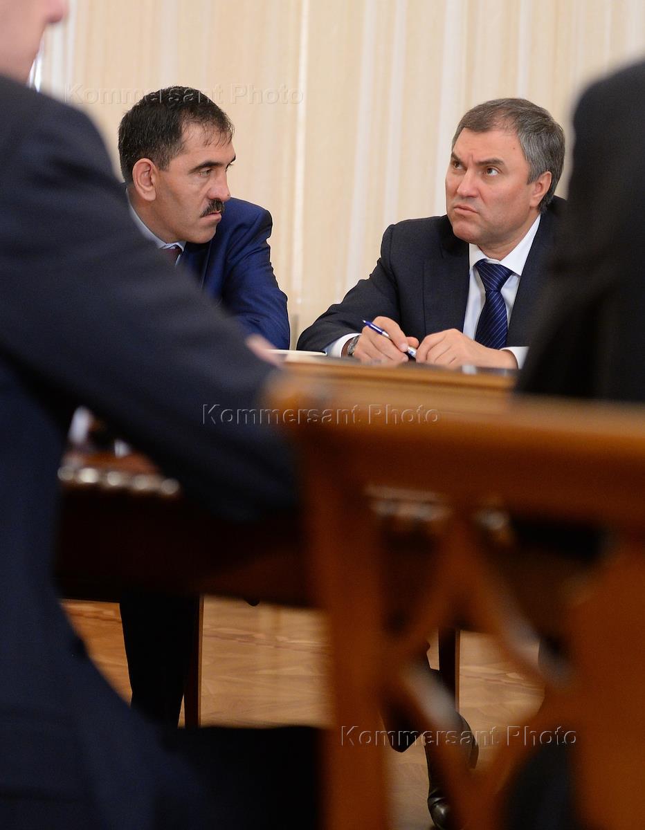Президент Республики Ингушетия Юнус-Бек Евкуров (слева) и первый заместитель руководителя администрации президента России Вячеслав Володин (справа) во время встречи президента России Владимира Путина с избранными главами субъектов России. Встреча прошла в резиденции президента России в Ново-Огарево.