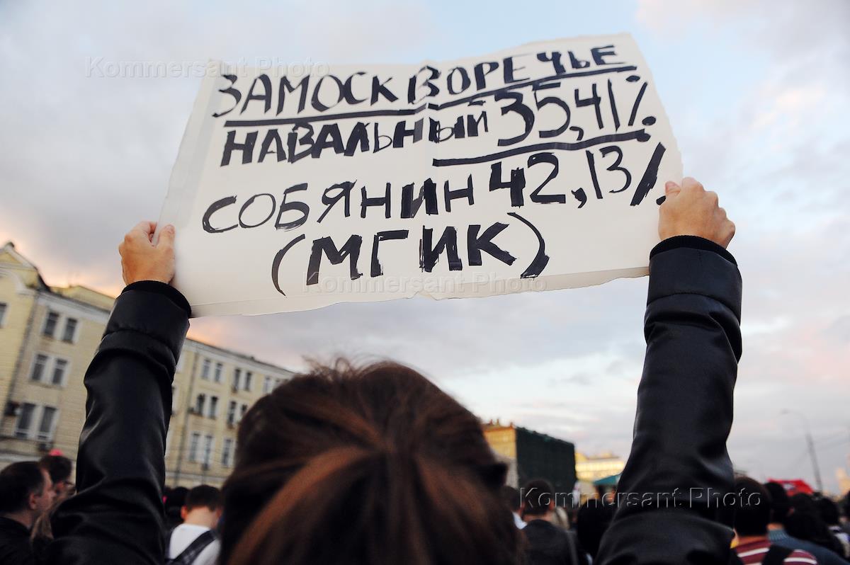 Митинг сторонников кандидата на выборах мэра Москвы, председателя Координационного совета оппозиции (КСО) Алексея Навального на Болотной площади. Плакат с надписью "Замоскворечье. Навальный - 35,41% Собянин - 42,13% (МГИК)!".