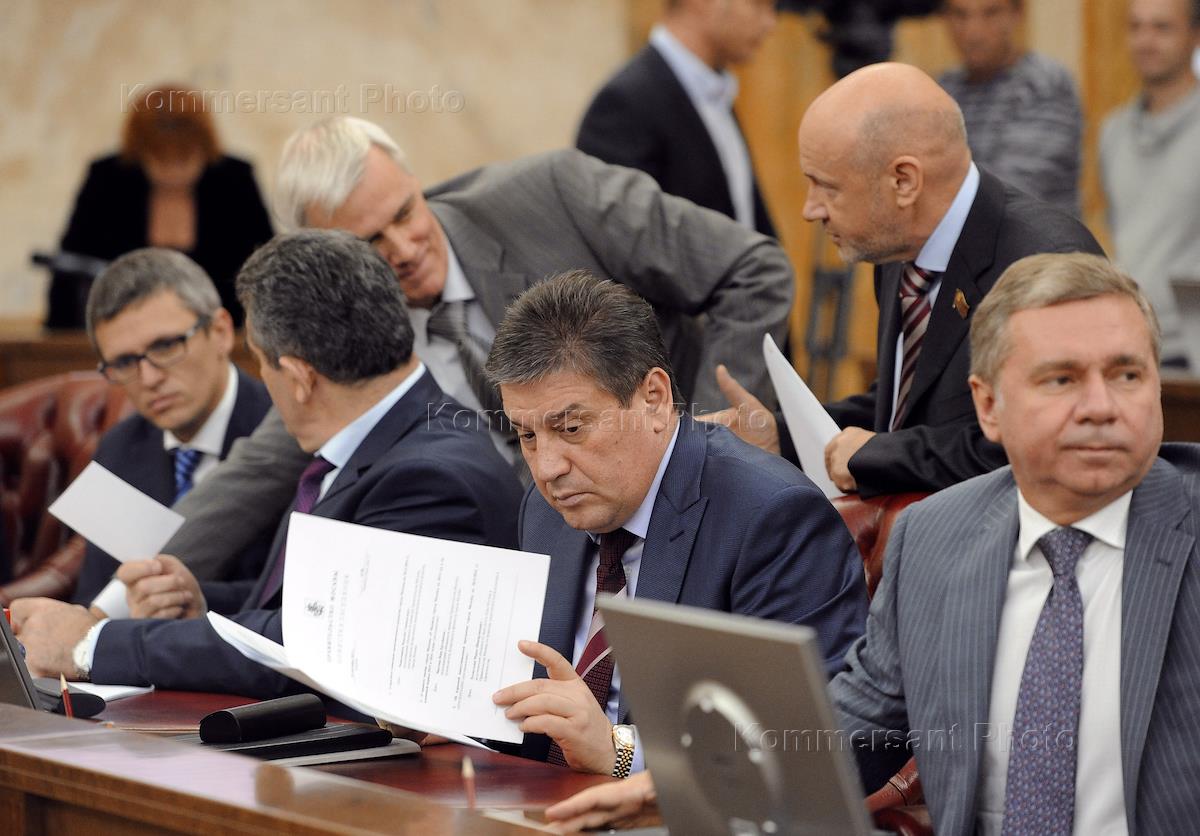 Руководитель Департамент социальной защиты населения города Москвы Владимир Петросян (в центре), председатель Московской городской думы Владимир Платонов (второй справа) и руководитель Департамента внешних связей правительства Москвы Сергей Черемин (справа) на заседании Правительства города Москвы.