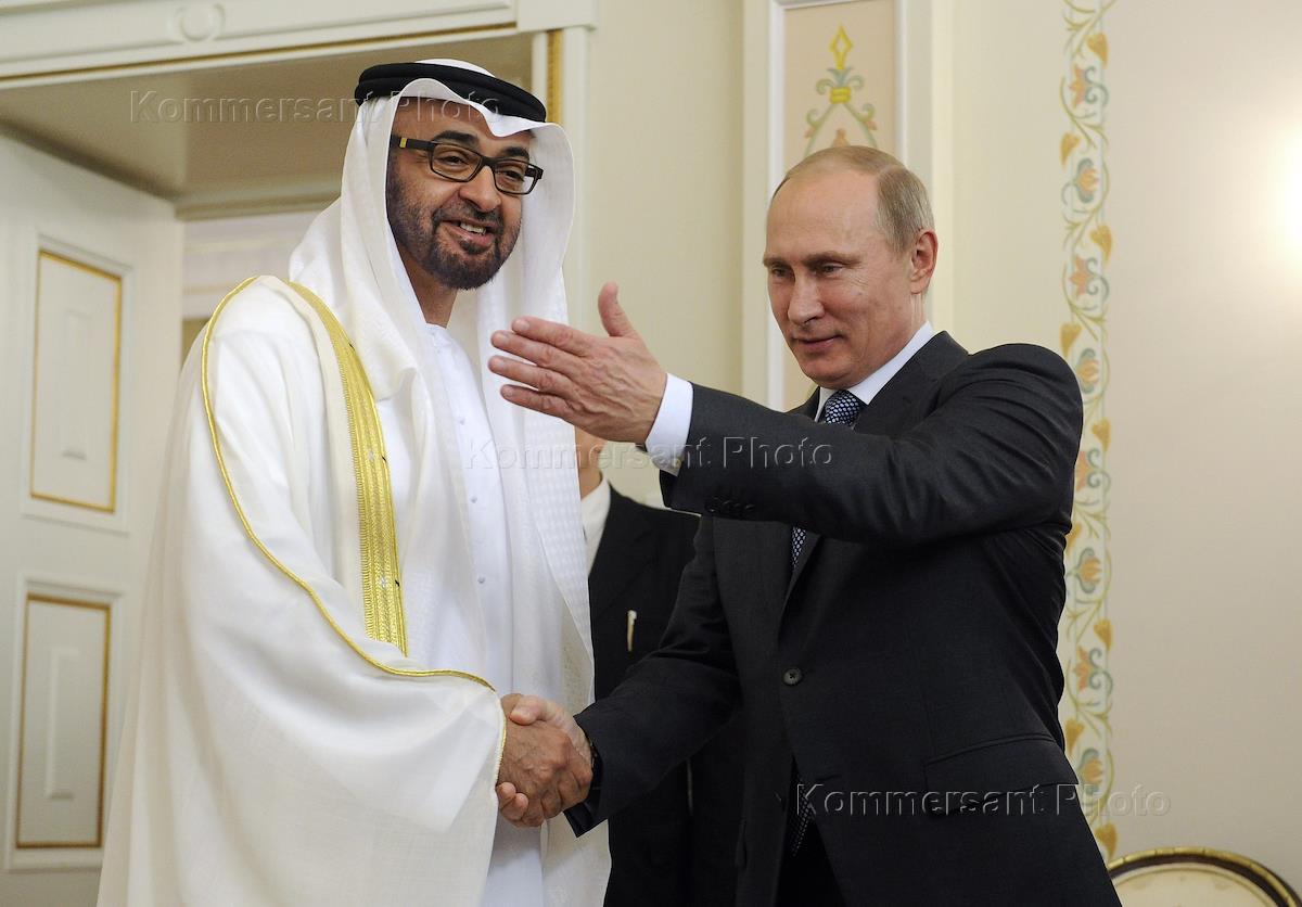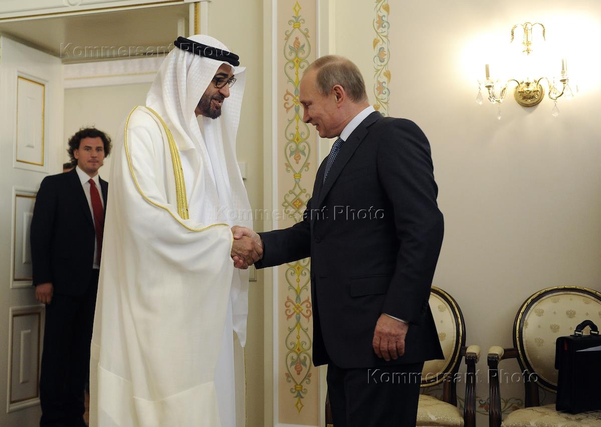 Наследный принц Абу-Даби, заместитель Верховного главнокомандующего Вооруженными силами Объединенных Арабских Эмиратов Мухаммед Аль Нахайян (слева) и президент России Владимир Путин (справа) во время встречи в президентской резиденции Ново-Огарево .