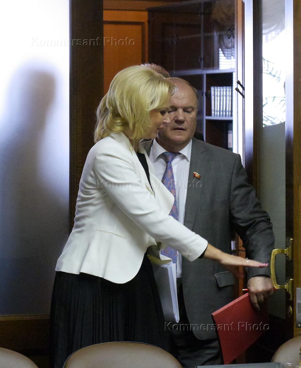 Лидер Коммунистической партии России (КПРФ) Геннадий Зюганов (справа) и кандидат на должность председателя Счетной палаты России Татьяна Голикова (слева) во время встречи депутатов от фракции КПРФ в Государственной думы России.