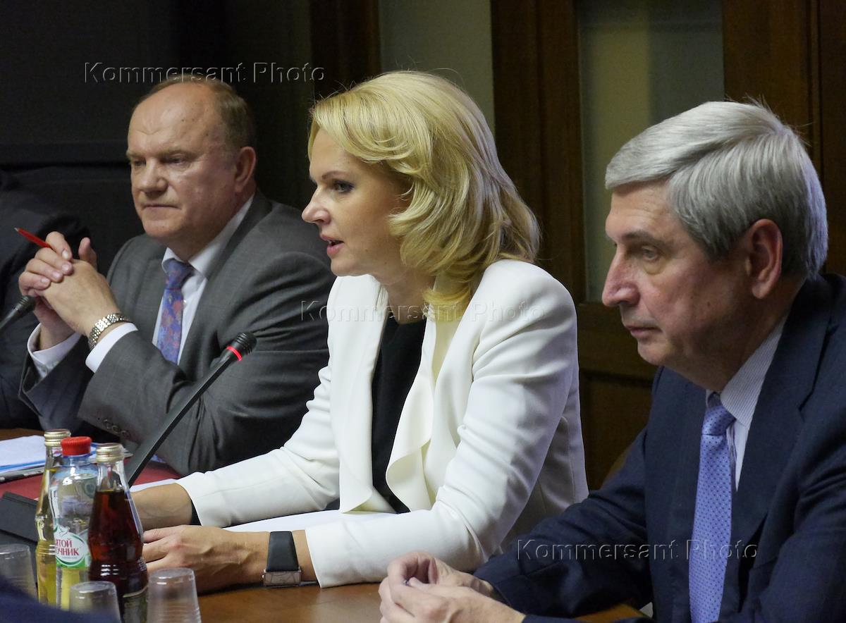 Лидер Коммунистической партии России (КПРФ) Геннадий Зюганов (слева) и кандидат на должность председателя Счетной палаты России Татьяна Голикова (в центре) во время встречи депутатов от фракции КПРФ в Государственной думы России.