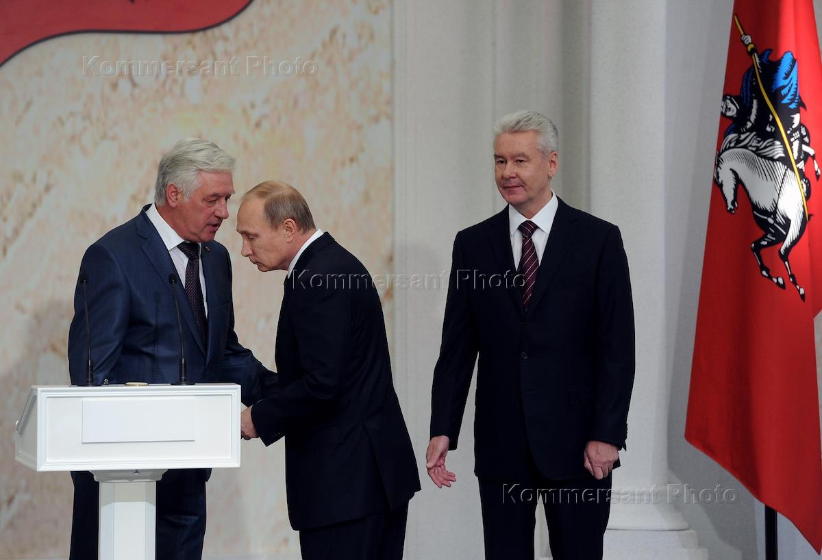 From left to right: Chairman Mosgorizbirkom Valentin Gorbunov, Russian President Vladimir Putin and elected mayor of Moscow Sergei Sobyanin during the inauguration ceremony at the museum of the Great Patriotic War on Poklonnaya Hill.