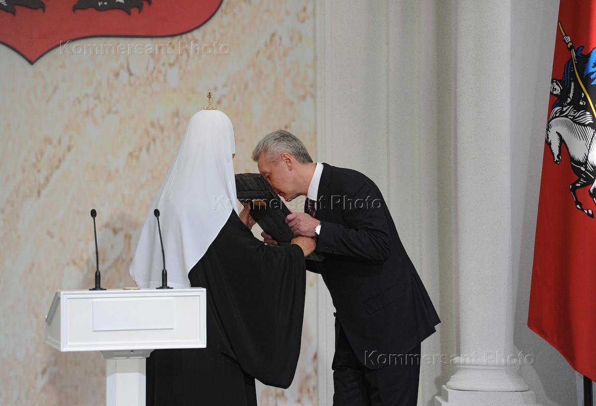 Patriarch of Moscow and All Russia, Primate of the Russian Orthodox Church Kirill (left) and the elected mayor of Moscow Sergei Sobyanin (right) during the inauguration ceremony at the museum of the Great Patriotic War on Poklonnaya Hill.