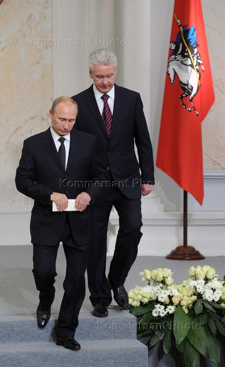 Russian President Vladimir Putin (right) and the elected mayor of Moscow Sergei Sobyanin (left) before the inauguration ceremony at the museum of the Great Patriotic War on Poklonnaya Hill.
