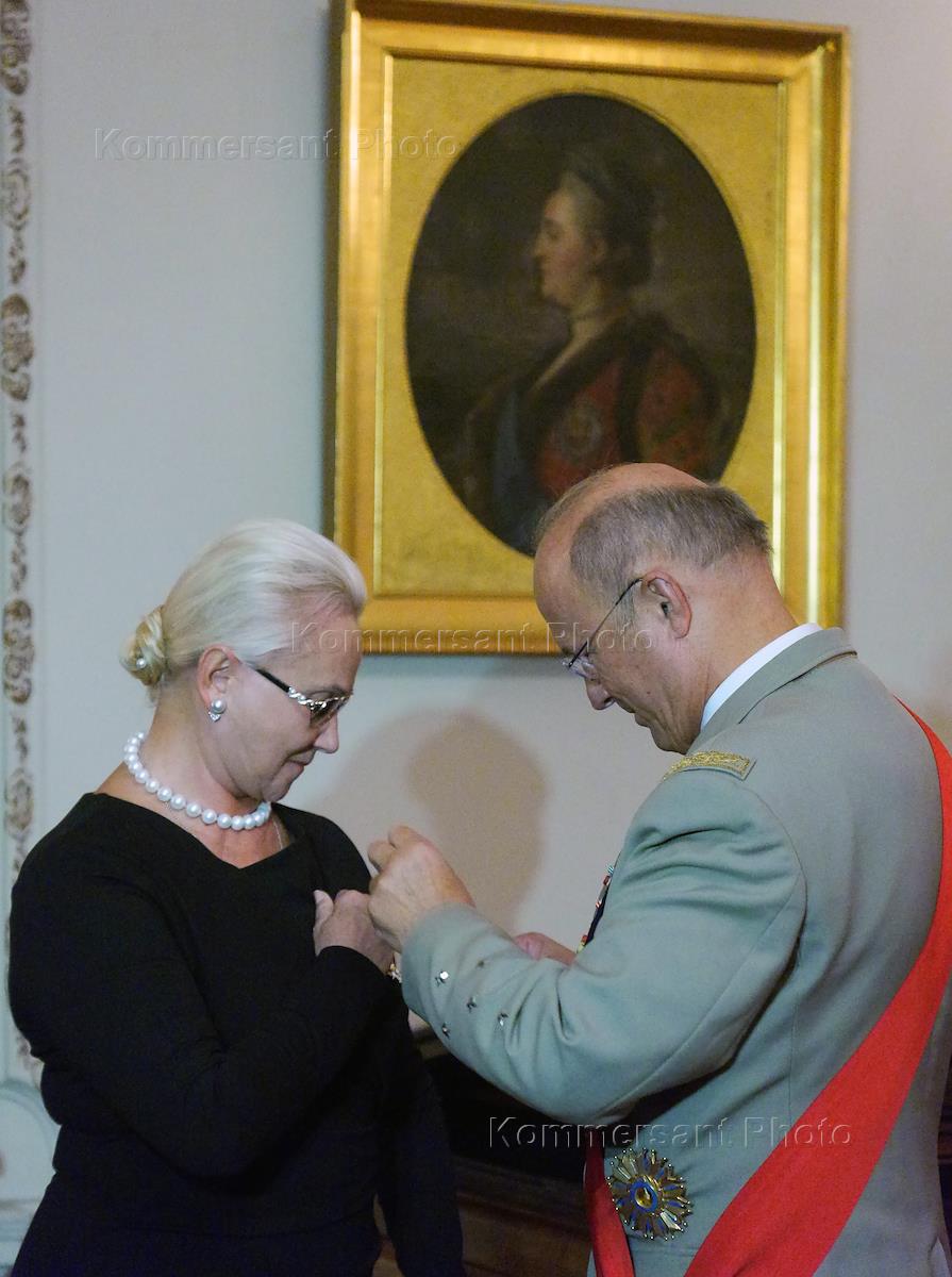 Chairman of the Russian State Duma Sergei Naryshkin (left) and founder of the Moscow House of Photography and Multimedia Art Museum director Olga Sviblova (right) during the awarding ceremony Head of the Federal Agency for Press and Mass Communications (Rospechat) Mikhail Seslavinskiy (center) and Chairman of the Interstate Aviation Committee (MAK) Tatyana Anodina signs Chevalier of the Order of Honourable Legion. The ceremony was held at the residence of the Ambassador of France in Russia.
