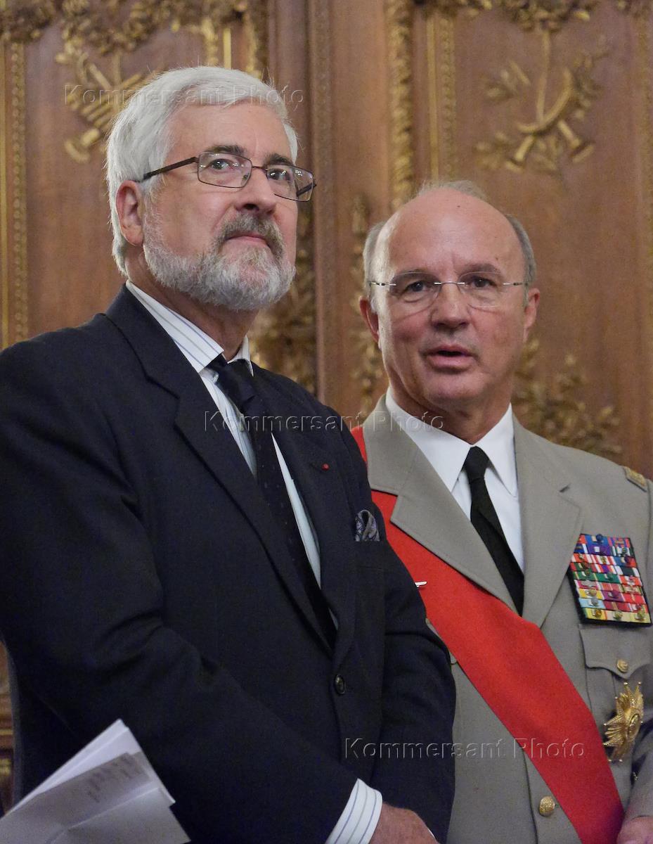 Grand Chancellor of the Legion of Honor, General Jean-Louis Zhorzhelen (right) during the awarding ceremony Head of the Federal Agency for Press and Mass Communications (Rospechat) Mikhail Seslavinskiy and Chairman of the Interstate Aviation Committee (MAK) Tatyana Anodina (left) signs Chevalier of the Order of Honourable Legion. The ceremony was held at the residence of the Ambassador of France in Russia.