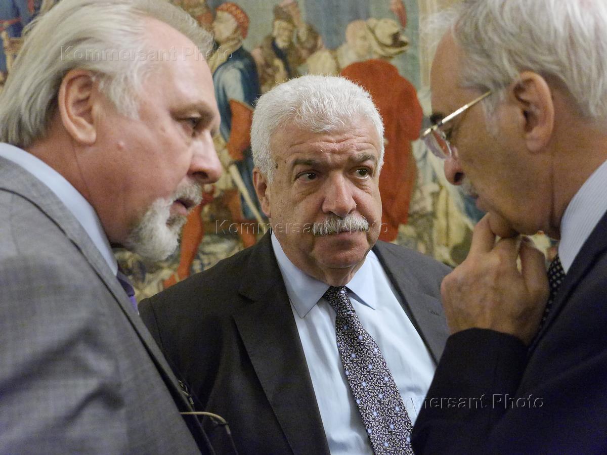 Director of strategic directions of the publishing house (PH) "Kommersant" Victor Lochak (left) and advisor to the Russian President Igor Levitin (right) during the awarding ceremony Head of the Federal Agency for Press and Mass Communications (Rospechat) Mikhail Seslavinskiy and Chairman of the Interstate Aviation Committee (MAK) Tatyana Anodina signs Chevalier of the Order of Honourable Legion. The ceremony was held at the residence of the Ambassador of France in Russia.