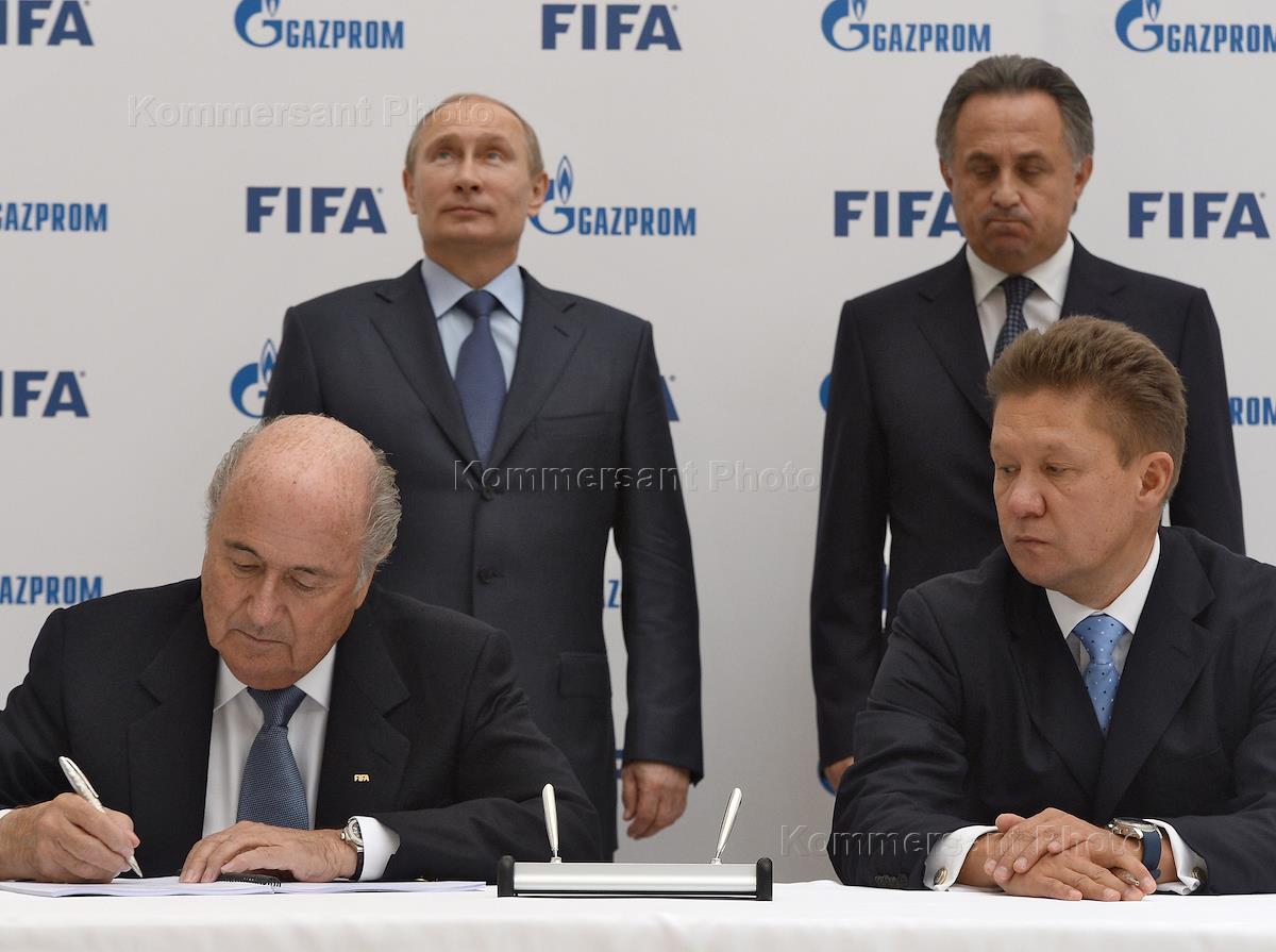 From left to right: President of the Federation of International Football Associations (FIFA) Joseph Blatter, Russian President Vladimir Putin, Russian Sports Minister Vitaly Mutko and Board Chairman of "Gazprom" (Russia) Alexey Miller during the signing of a partnership agreement.