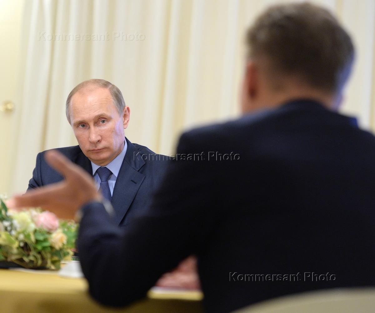 Президент России Владимир Путин (слева) и председатель правления компании "Газпром" Алексей Миллер (справа) во время подписания партнерского соглашения.