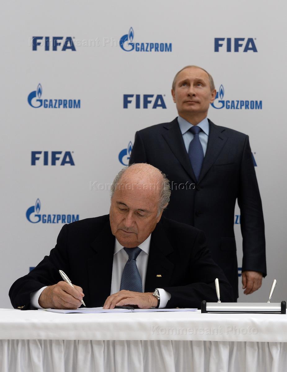 Президент Международной федерации футбольных ассоциаций (ФИФА/FIFA) Йозеф Блаттер (слева) и президент России Владимир Путин (справа) во время подписания партнерского соглашения о сотрудничестве с компанией "Газпром".