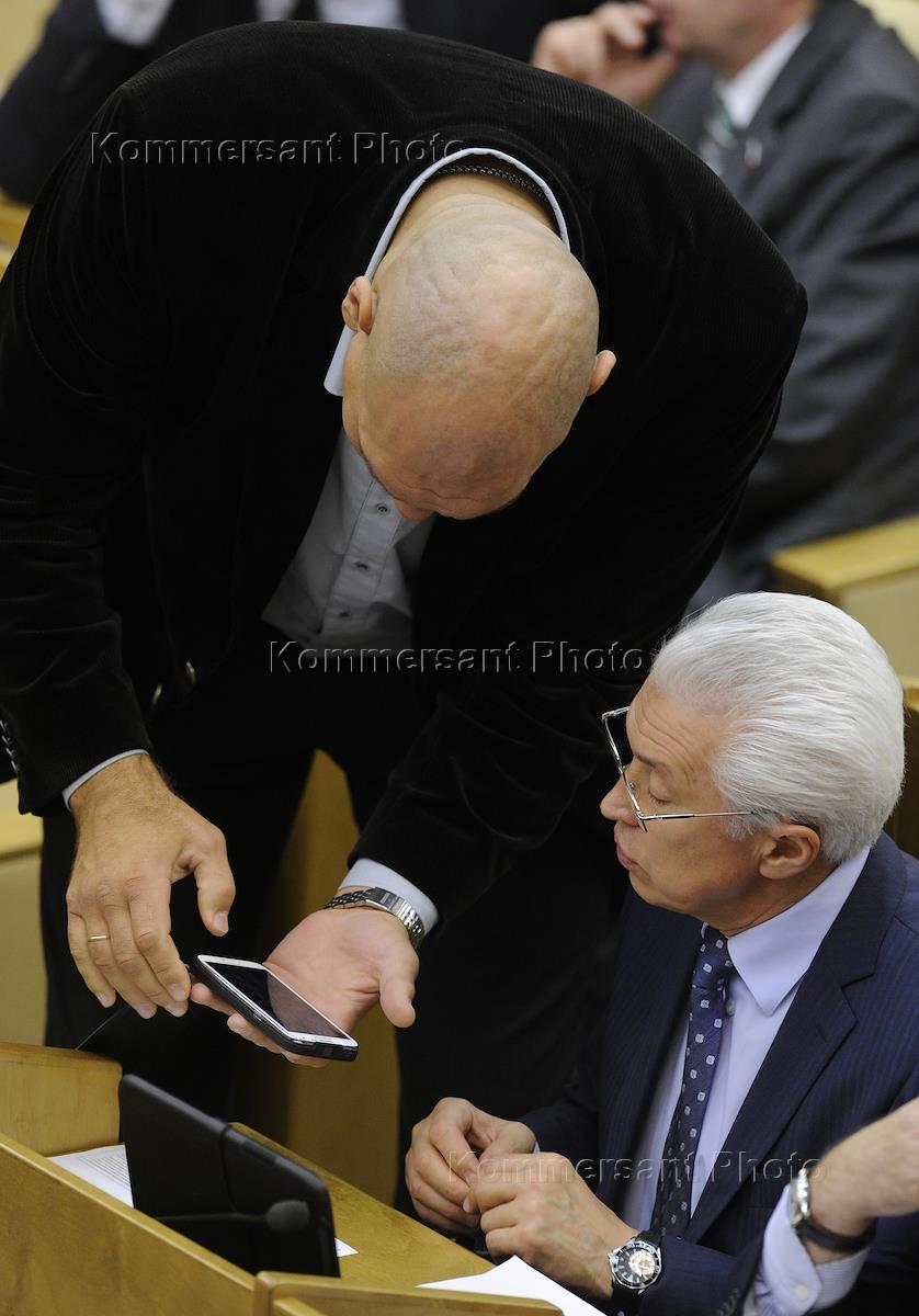 Член комитета Государственной думы (ГД) России по физической культуре, спорту и делам молодежи Николай Валуев (слева) и заместитель председателя ГД России Владимир Васильев (справа) во время пленарного заседания Госдумы России.