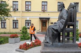 Супруг дворника ЖЭС-2 города Кронштадт Галины Садовничей Владимир помогает супруге.
