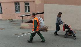 Дворники ЖЭС - 2 города Кронштадт во время работы. Общежитие куда селят дворников при приеме на работу на Кронштадтском шоссе, дом 28.