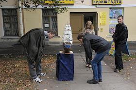 Жанровая фотография. Макет морского корабля у входа в магазин сувениров.