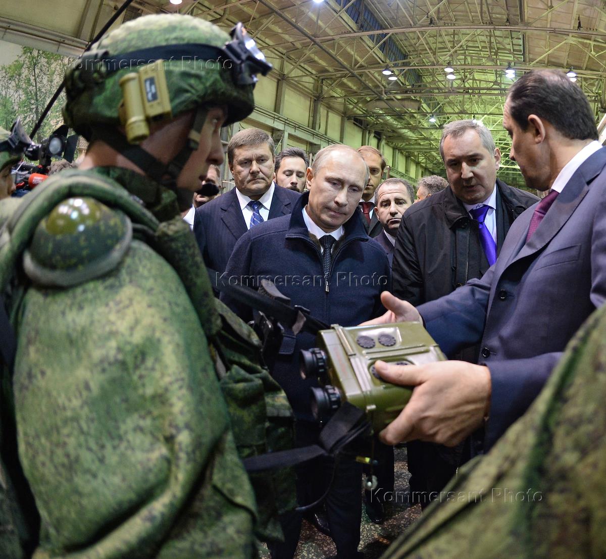 Заместитель председателя правительства России Дмитрий Рогозин (справа), президент России Владимир Путин (второй слева) и председатель совета директоров ОАО "АВТОВАЗ", генеральный директор Государственной корпорации "Ростехнологии" Сергей Чемезов (справа) во время посещения предприятия ОАО "Концерн "Калашников" в Ижевске.во время посещения предприятия ОАО "Концерн "Калашников" в Ижевске. П
