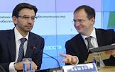 Министр России по связям с Открытым правительством Михаил Абызов (слева) и министр культуры России Владимир Мединский (справа) во время заседания "круглого стола" на тему "Общественное обсуждение "антипиратского закона". Заседание прошло в РИА "Новости".