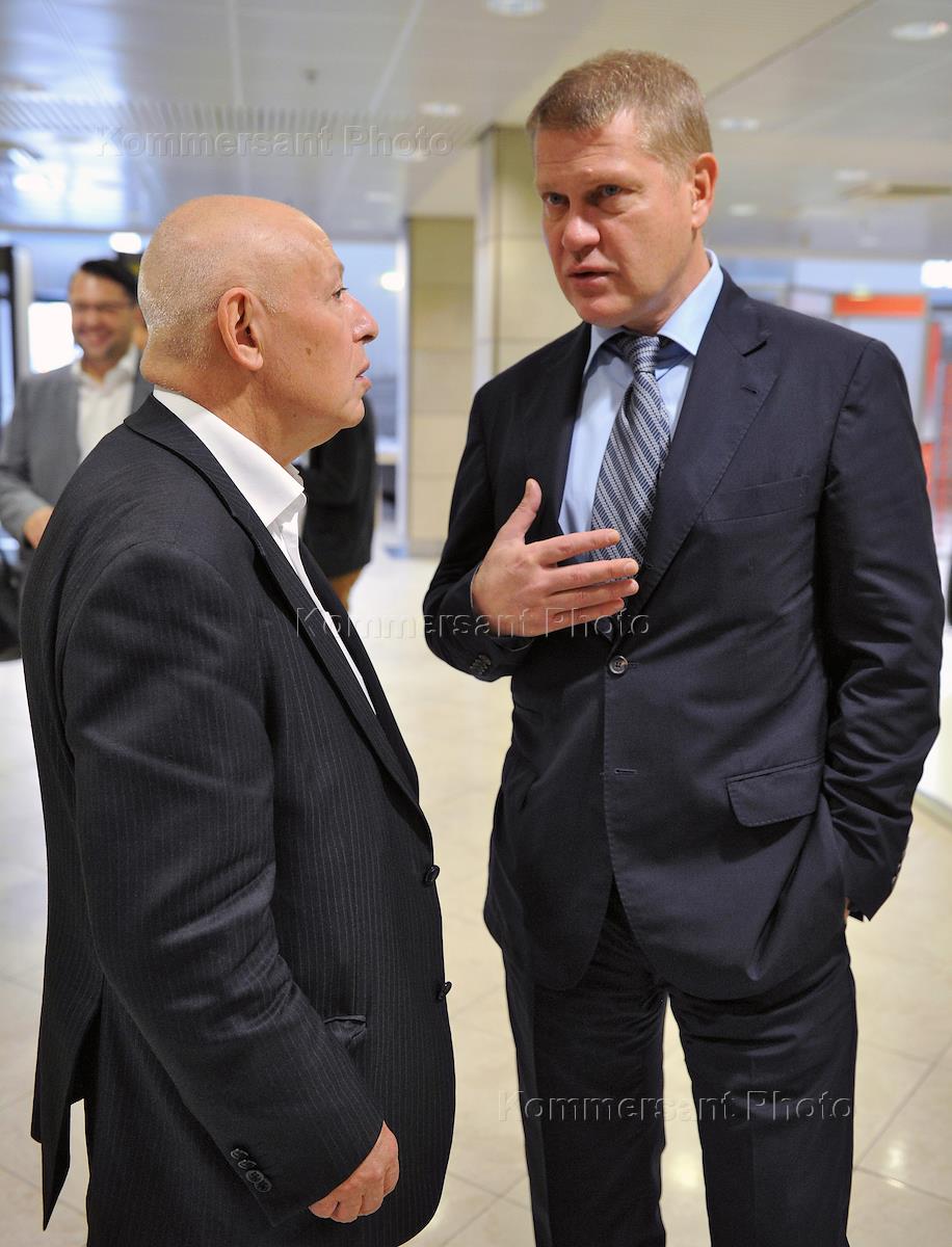 Art historian, director of the Institute of Modern Art Joseph Bakshtein (left) and Deputy Russian Minister of Culture Ivan Demidov (right) during a preview of the main project V Moscow Biennale of Modern Art "More Light" in the Central Exhibition Hall (CEH) "Manege".